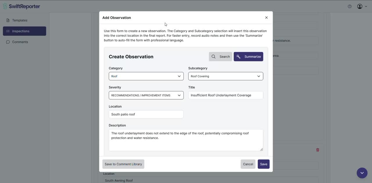 Quickly add observations to the report by using your Comment Library, by creating audio notes and letting our AI draft a professional comment for you, or searching your Comment Library with the transcript from your audio note. Our intelligent search uses AI to transcribe and determine the meaning of your audio note, so you can find the perfect matching comment every time, just by describing the issue as you see it.