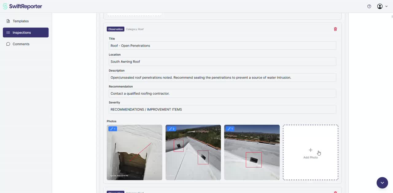 Uploading Photos is a breeze! Take your photos using our Mobile App to instantly add them to the report and generate observations as you go, or use our web app to drag-and-drop, or select multiple photos at once. We also support annotations on the photos to highlight key points of interest.
