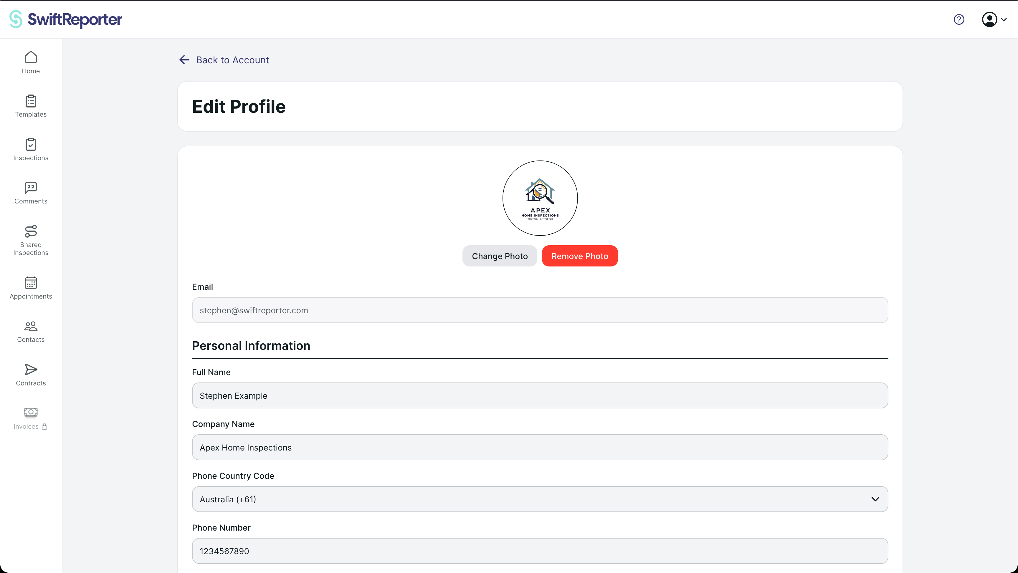 Your profile contains your personal, business, address, professional, and social media information. This information is automatically used to populate the cover page of reports you generate, so keeping it current ensures professional-looking reports.